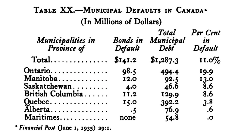 So, in short, we know that many municipalities in Canada stopped being able to pay their debts in the 1930s. The lack of fiscal assistance at the federal and provincial level, particularly at the start of the Great Depression, combined with varied and still developing institutional structures (e.g., ‘growth pays for growth’) for municipalities, created a perfect storm that resulted in a need for both fiscal and political intervention by the provinces and, in some cases, the Government of Canada itself.