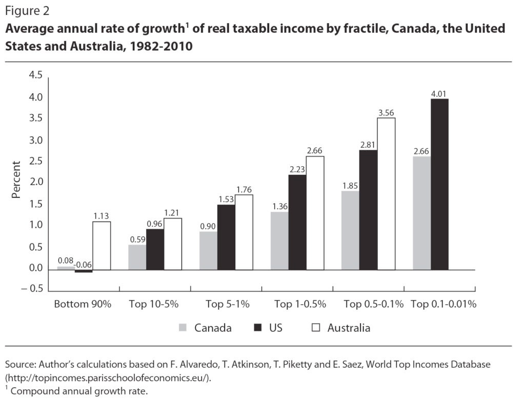 90% of Canadians saw their income grow by 0.08% from 1982 to 2010, while the top 0.1 to 0.01% saw their incomes grow by 2.66%.