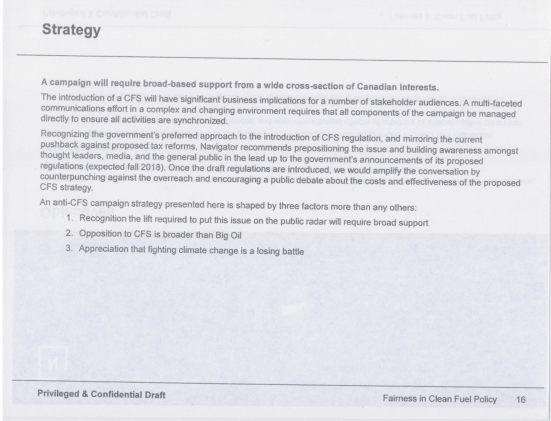 Navigator did some very impressive research to develop a series of messages and strategies against the national government's then-proposed Clean Fuel Policy. Their strategies draw on decades of campaign experience in how to shape broad social perceptions of an issue in a way that benefits a particular group As they detail in the deck, the central thrust of the work is to make it clear that the argument about the policy is not about climate change, and that it is not industry who will be the primary beneficiary if it is softened or repealed.