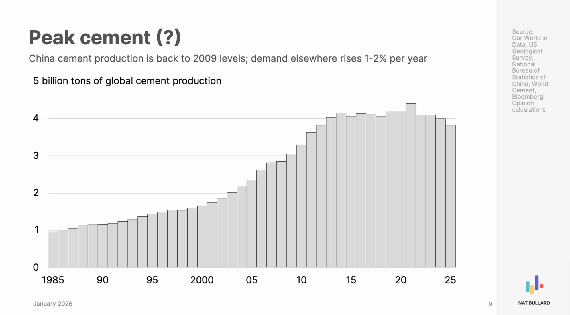 This downward in cement demand is actually a trend I have wanted to write a piece on for some time after reading the World Cement Association (WCA)'s 2024 Long Term Forecast for Cement and Clinker Demand. Bullard's graph here only runs to 2025, but as the whitepaper said at the time: "global cement demand in 2050 is likely to be much lower than current forecasts, around 3 billion tonnes per annum." As you can see, in 2021, globally we broke 4 billion tonnes per annum, but have been trending down since then.