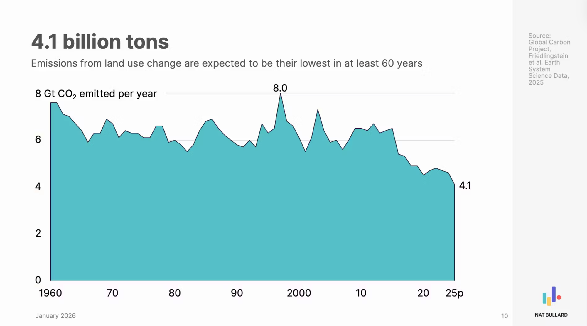 While global emissions from land use change remain high, according to the Global Carbon Project, they have decreased since their peak in the late 1990s. This is thankfully due to some success: we've cut down significantly on the deforestation, particularly in South America. We've also done a lot of afforestation, with huge forrests (0.9 gigatonnes worth) planted in China, the US, and the European Union, offsetting almost the equivalent of Japan's annual emissions (1.1 gigatonnes).