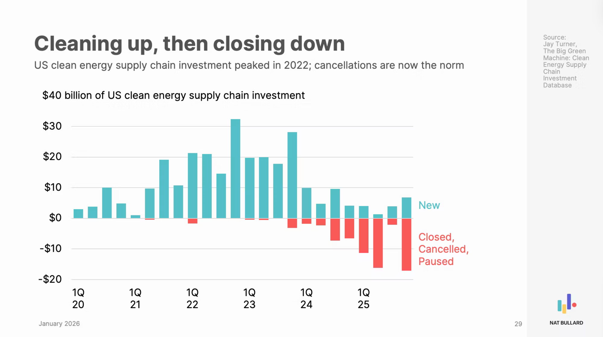 By Q3 of 2025, the Clean Energy Investment Monitor reported year-over-year declines of 56% in new industrial decarbonization projects, 26% in manufacturing, and 5% in consumer distributed energy technolgies. There were gains, too, but the overall picture is not rosy.