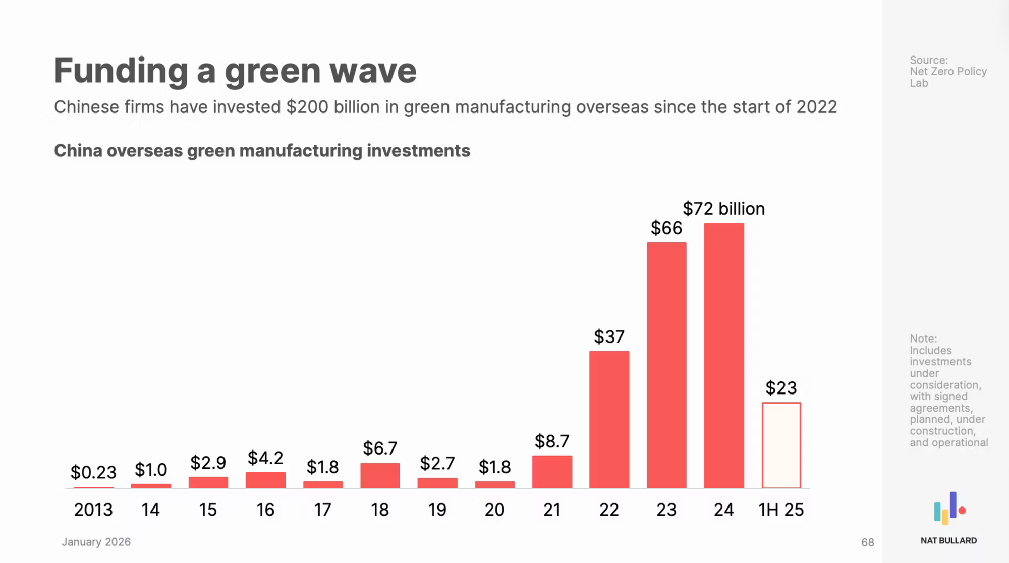 This was actually probably one of my favourite slides in the whole deck. We're used to hearing about Chinese domestic investments in renewable energy manufacturing, but Bullard highlights this fascinating data showing that China is not only investing at home, but also abroad.