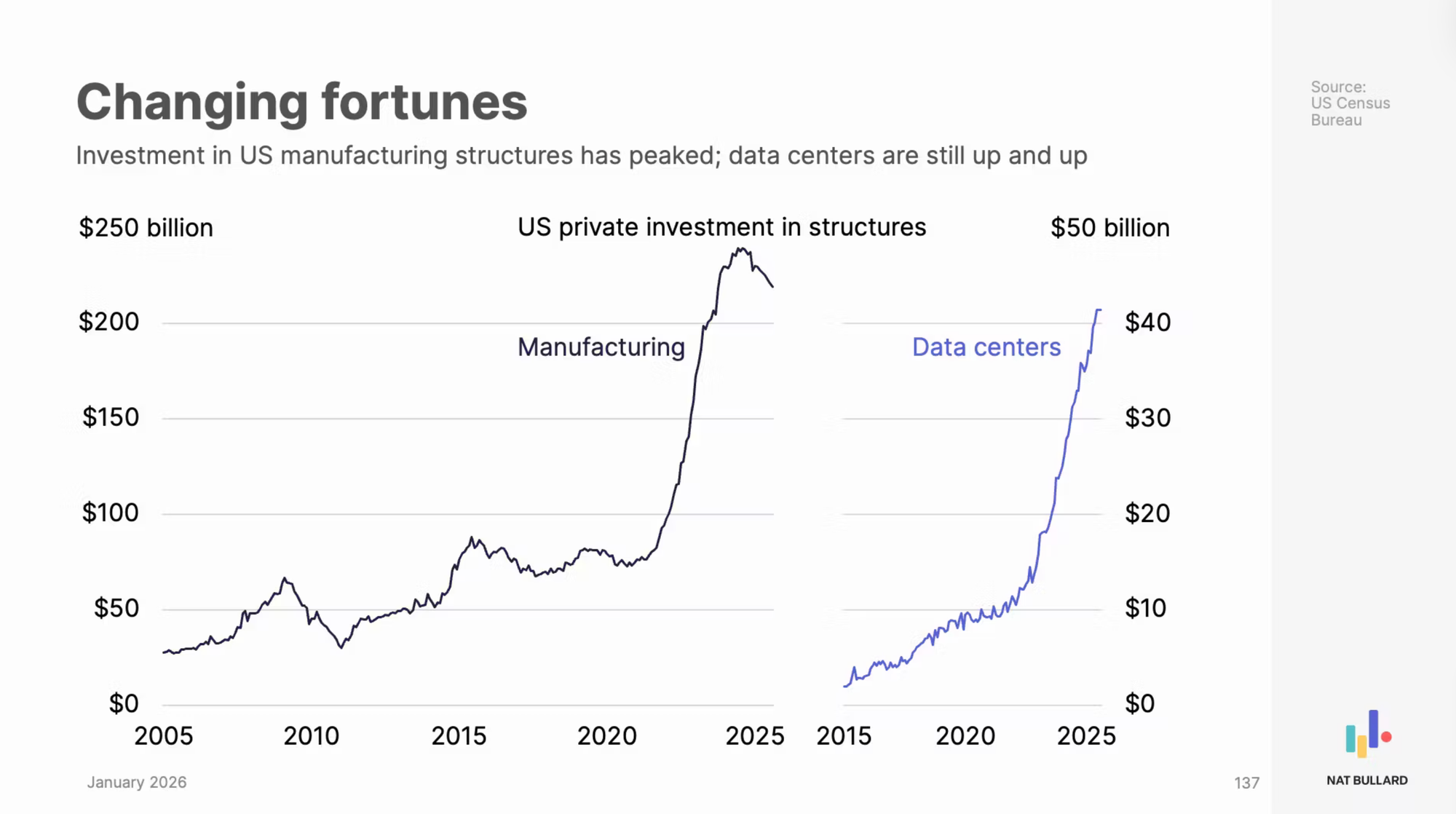 Data centres aren't entirely synonymous with AI, or even large language models (LLMs) like Claude, ChatGPT, or DeepSeek. But they're very, very related, and the companies making the biggest investments generally find their way back to this business model. The wealth creation prospects from AI are, at the level of the whole economy (i.e., GDP), immense. But these kinds of investments reflect an acceleration of the American business model of the past three decades: we'll design it, finance it, and maybe assemble some (physical) pieces of it, but we want others to make most of the rest of it.