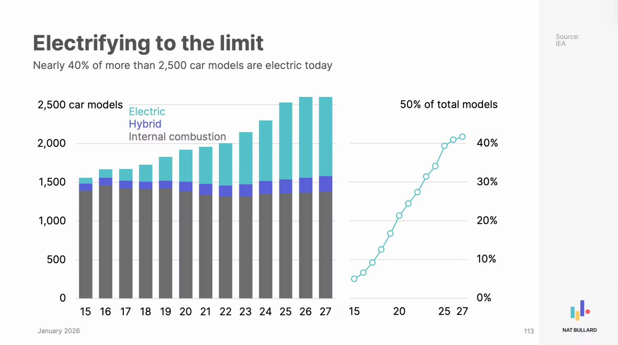 Instead of looking at the total production of vehicles, Bullard's slide here takes the somewhat more novel approach of looking at the share of EVs in terms of number of models rather than units. The story is clear: EV's have almost reached parity with combustion vehicles, meaning that in liberalized markets (i.e., not Canada or the US) you'll have a 40/60 split on the car lot of what kind of model you can take. The more proliferate these models become, this story implies, the more likely you are to buy an EV.