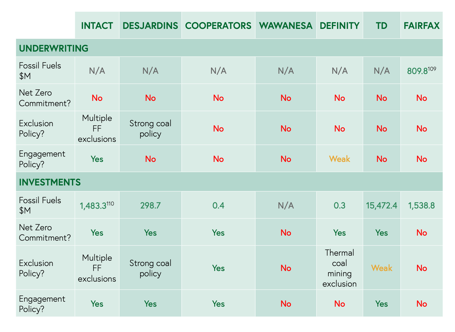 As is always the case in Canada around the energy transition, the story is complex. The Co-operators are owned in part by the Federation of Alberta Gas Co-ops, for example. And while they and others can avoid big investments in fossil fuels, underwriting some aspect of fossil fuel infrastructure (e.g., drilling, pipeline services, etc.) becomes a trickier undertaking. Everyone's implicated in the transition, and, with varying levels of effort and speed, everyone's trying to figure out how they get to the other side whole. But some, as the table above shows, have more pep in their step than others, to put it politely.