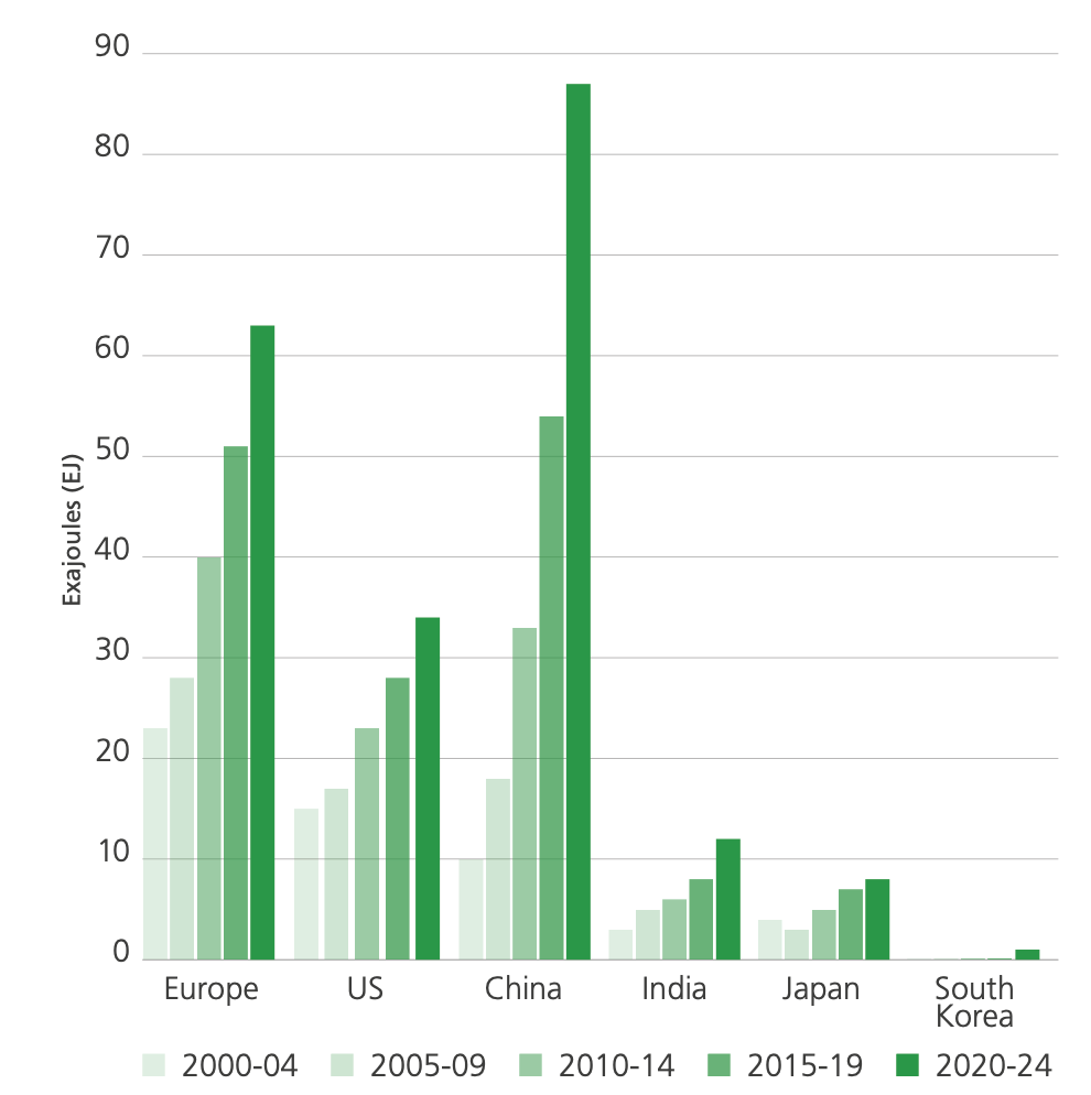 A leading investor in renewable energy, China is at the forefront of realising such benefits. Whilst it is still heavily reliant on energy imports, they met around 25% of its total energy demand in 2024, renewables have helped it avoid importing around 87 EJ over the past five years, more than Europe’s total energy demand in 2024.