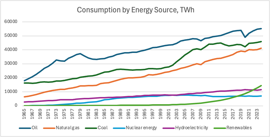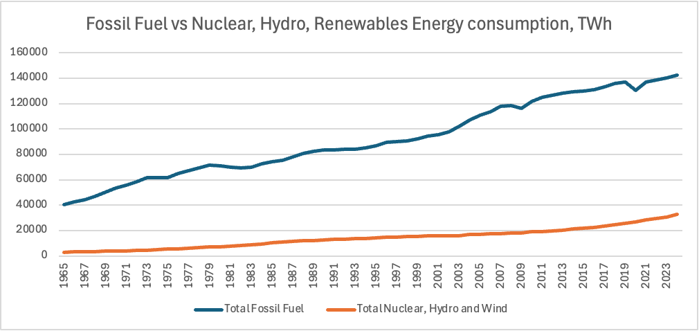 Adding the Energy Institute’s non-fossil fuel energy is a first helpful comparison. Clearly, fossil fuels dominate the energy mix. However, non-fossil energy consumption is clearly accelerating.