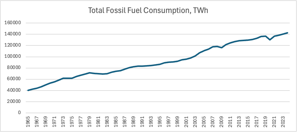 Often people start with just total amalgamated fossil fuels comsumption. From that high-level perspective, we see the steady, endless rise of fossil fuel consumption.