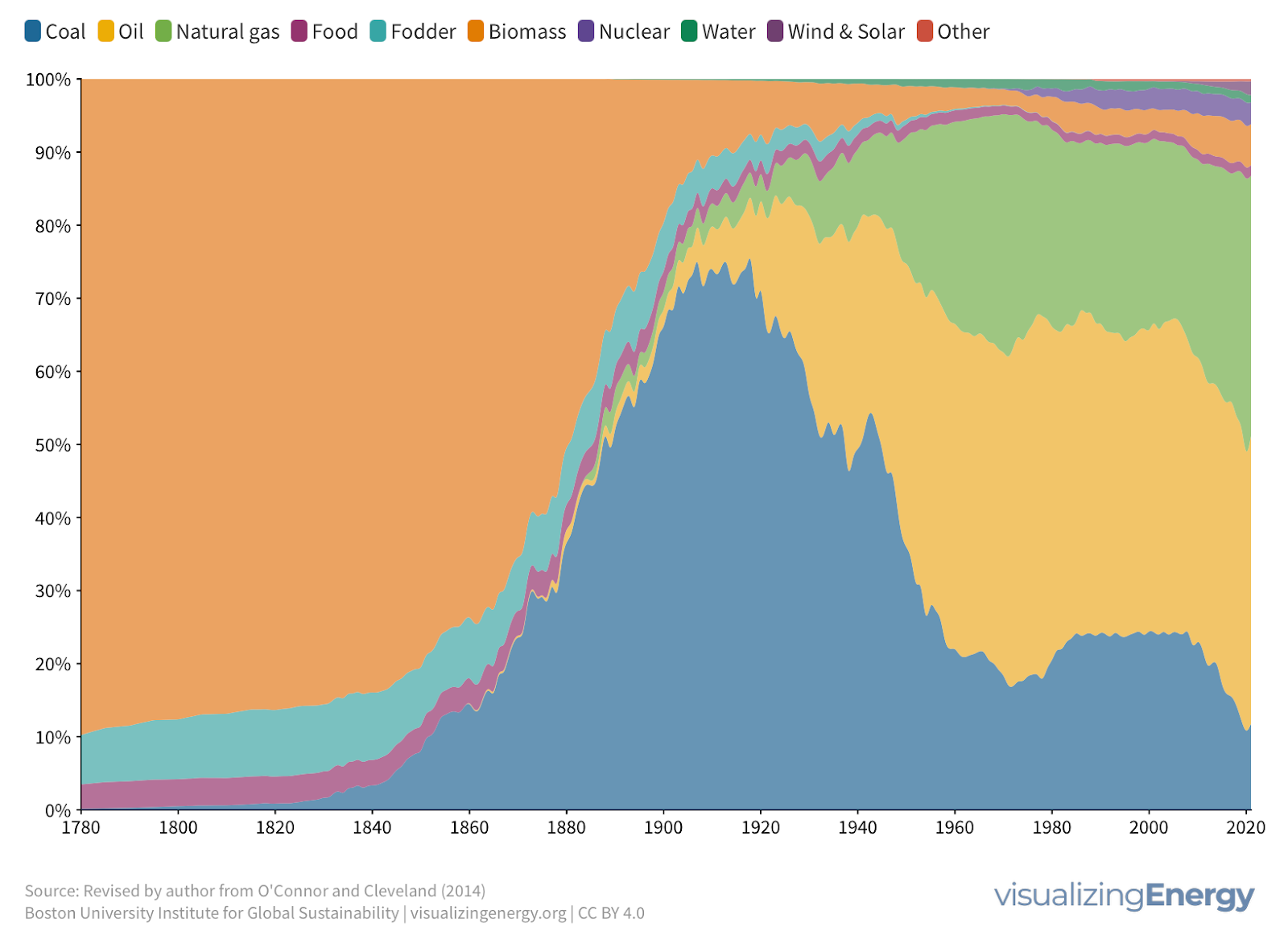 Bond disagrees and uses the example of fodder for horses, which used to actually be (believe it or not!) a primary source of energy, almost 10% of total energy in 1835.