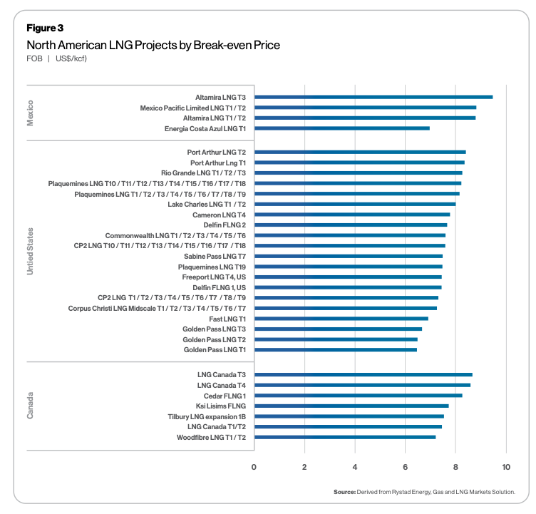 “Qatar, whose gas already accesses markets Canada hopes to sell to, is set to increase its production capacity by 85% to 142 MTPA by 2030 and is able to break even at $6.75/MMBTU shipping to Asian markets. Qatar’s North Field Expansion project is set to be the world’s largest.”