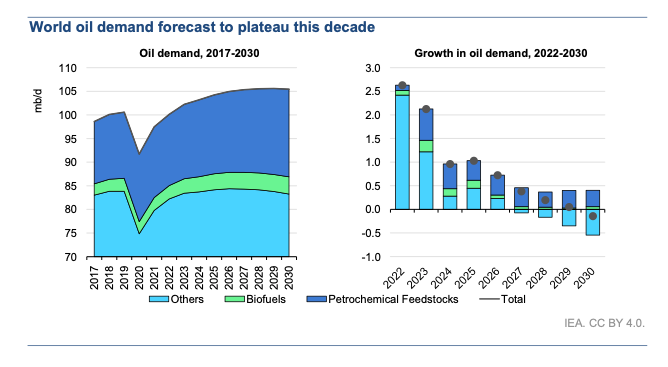 Between now and 2030, global demand for oil, which also includes biofuels, will "level off" at near 106 million barrels per day, and begin to decline after that. Interestingly, most of this growth will be led by the use of petrochemicals and not by significant growth in combustion.