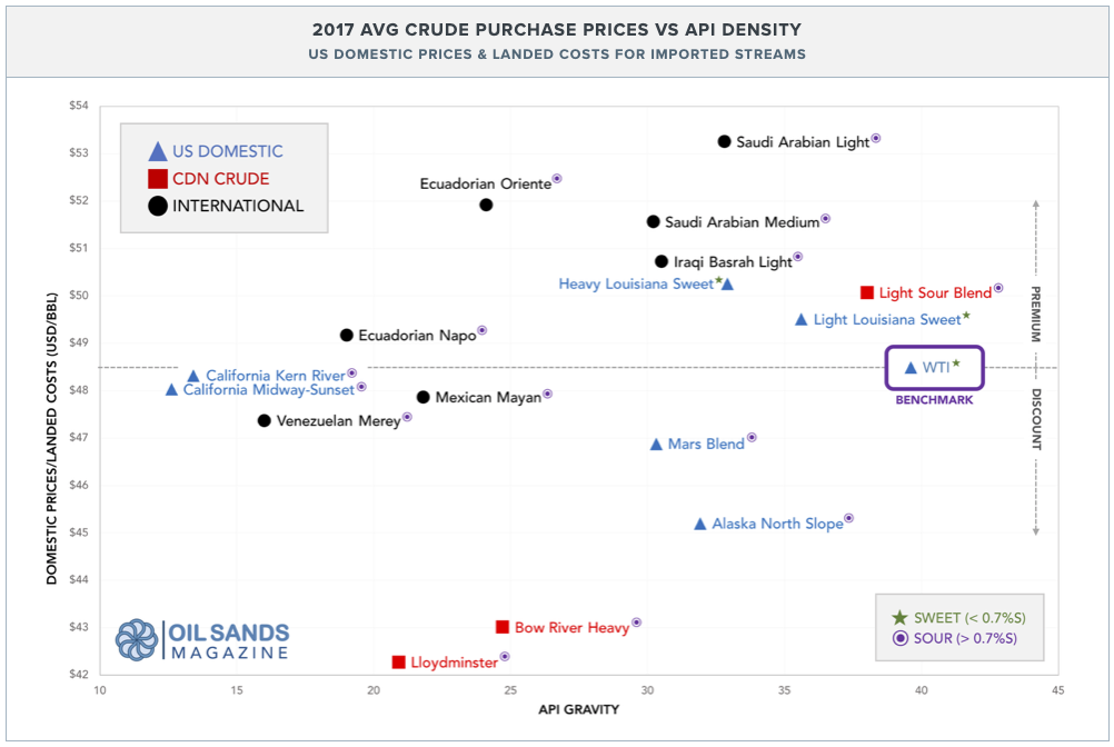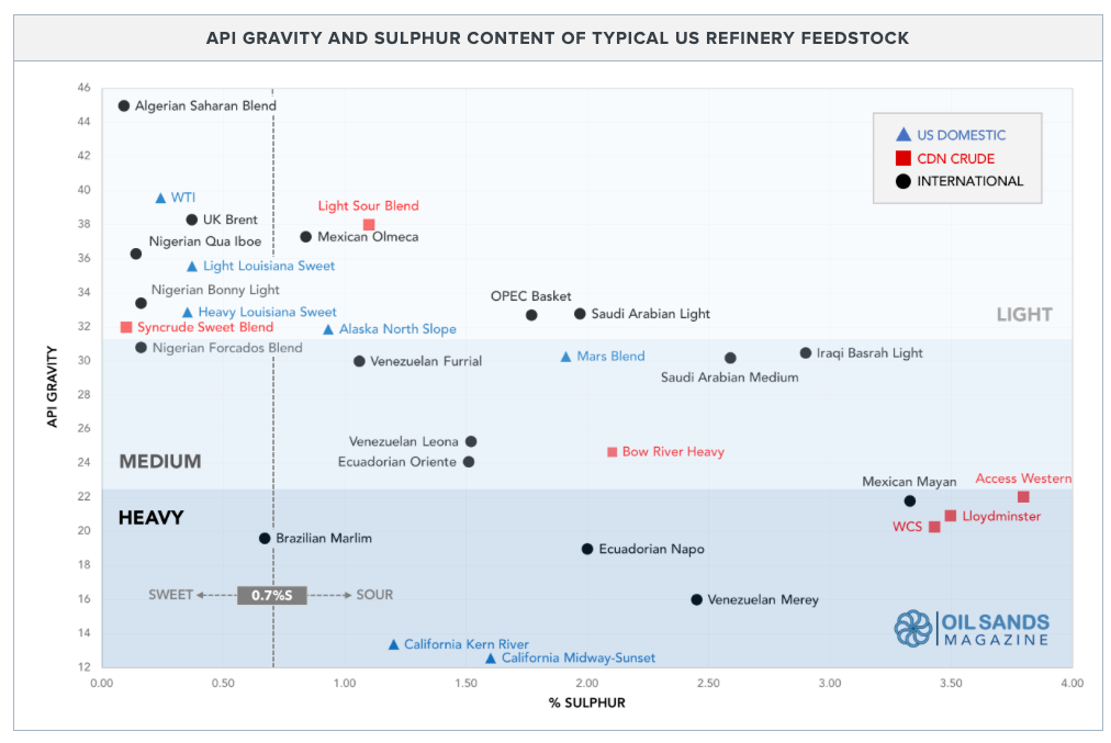 IISD doesn't dwell on the question of refinement as much, but as Oil Sands Magazine has covered in the past, WCS' price differential to WTI has a number of different factors that cause it, one of the most important being quality. Heavier crude oils require more complex (and costly) facilities, when accounting for the two crucial factors of density ("API Gravity") and sulphur content.