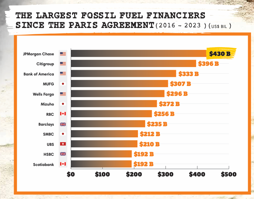 The 60 biggest banks globally committed $705 [billion] USD to companies conducting business in fossil fuels in 2023, bringing the total since the Paris agreement to $6.9 [trillion].