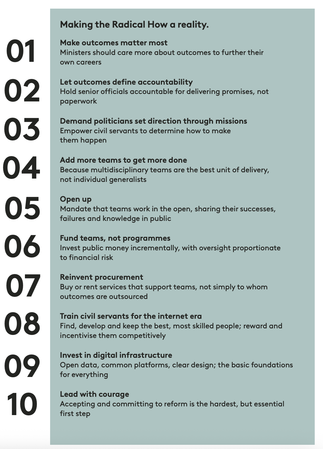 The Radical HowIn 2024, they released The Radical How, a literature review on state capacity and framework for public sector transformation. In it, they brush aside arcane debates about development theory and get into the brass tacks of delivering better services, drawing on insights from the design and tech worlds, while also harkening back to prior periods of social reform like the Beveridge Report.